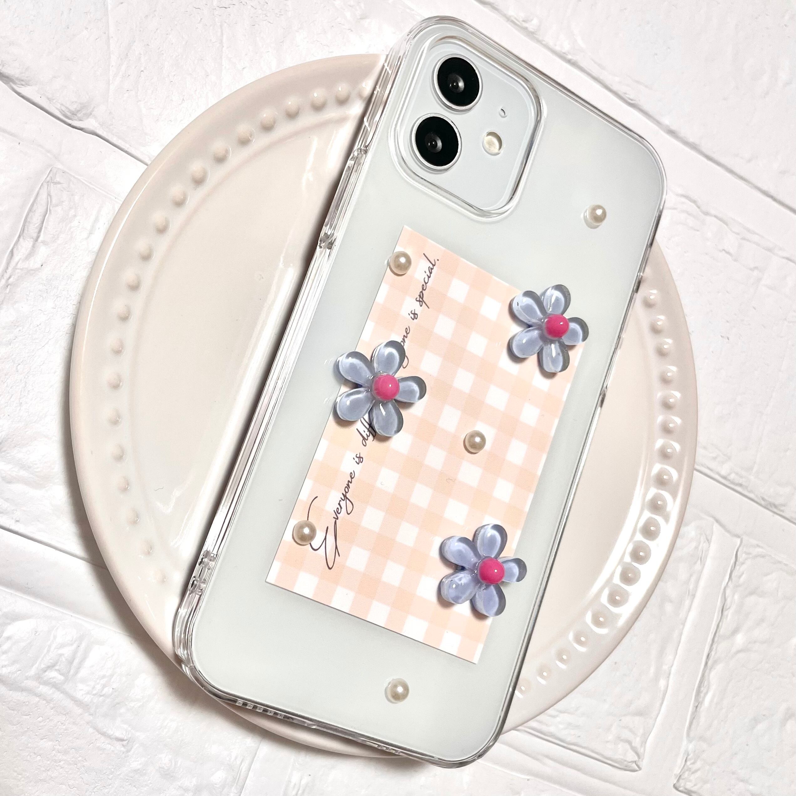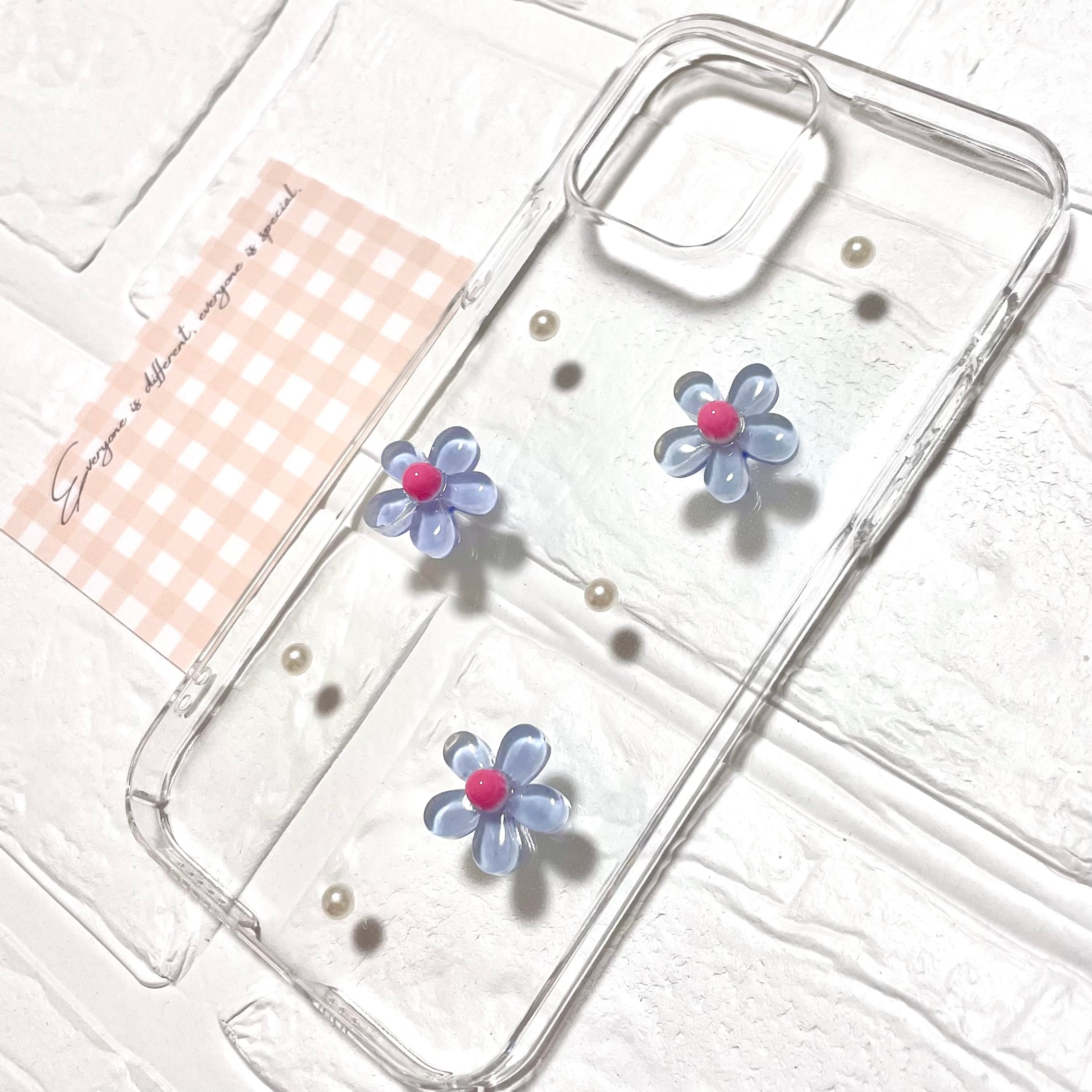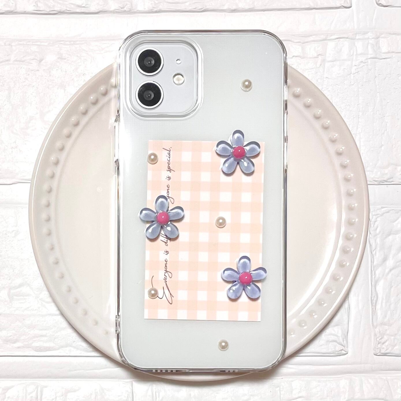 ギンガムチェックとお花のiPhoneケース(水色)